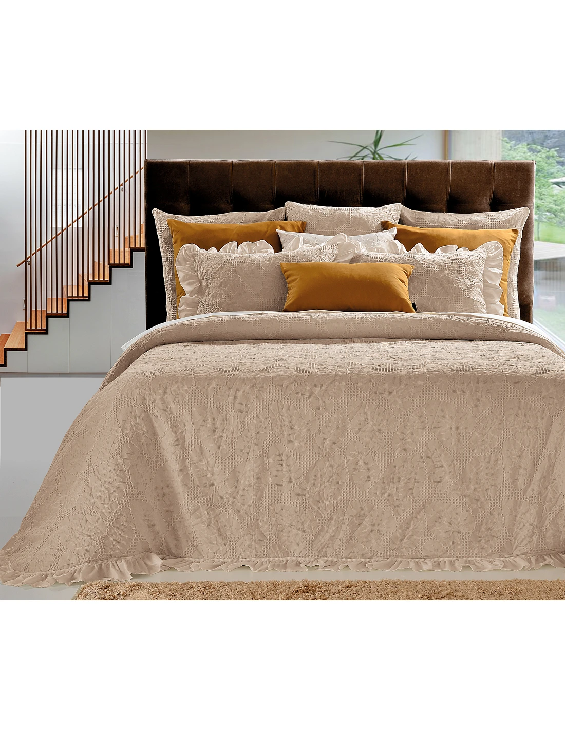 250x260 CM - COLCHA VERANO CON VOLANTES - COLCHA TEXTURA NIDO DE ABEJA - COLCHA VERANO COLOR TAUPE