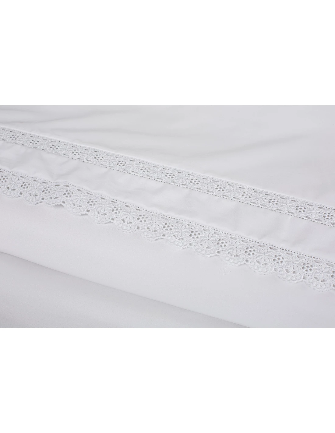Fino encaje aplicado en sábana encimera y fundas de almohada en los 2 laterales.