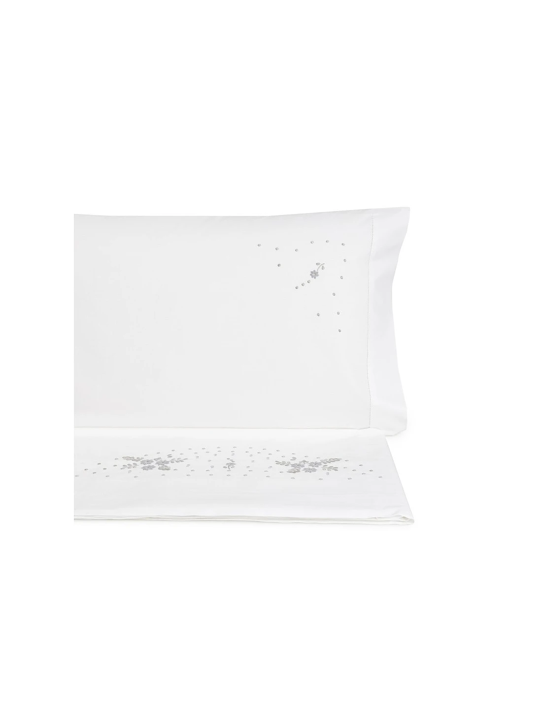 Juego de sábanas bordadas a mano sobre cartoncillo. Gris sobre blanco.
