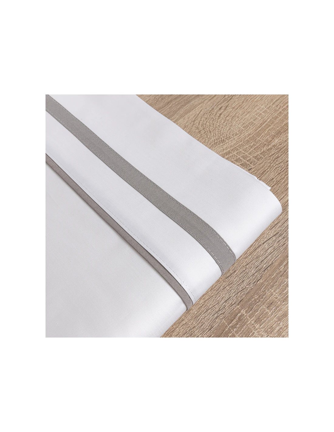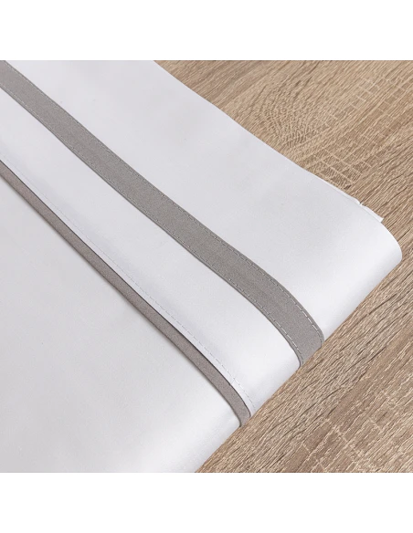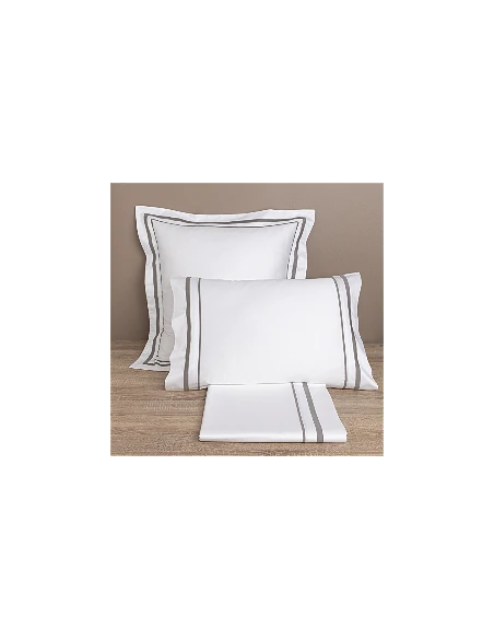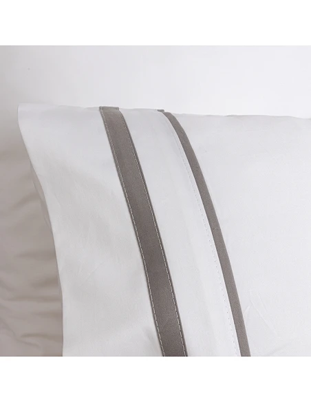 Barras en saten color gris aplicadas en sábana encimera y fundas de almohada en los 2 laterales.