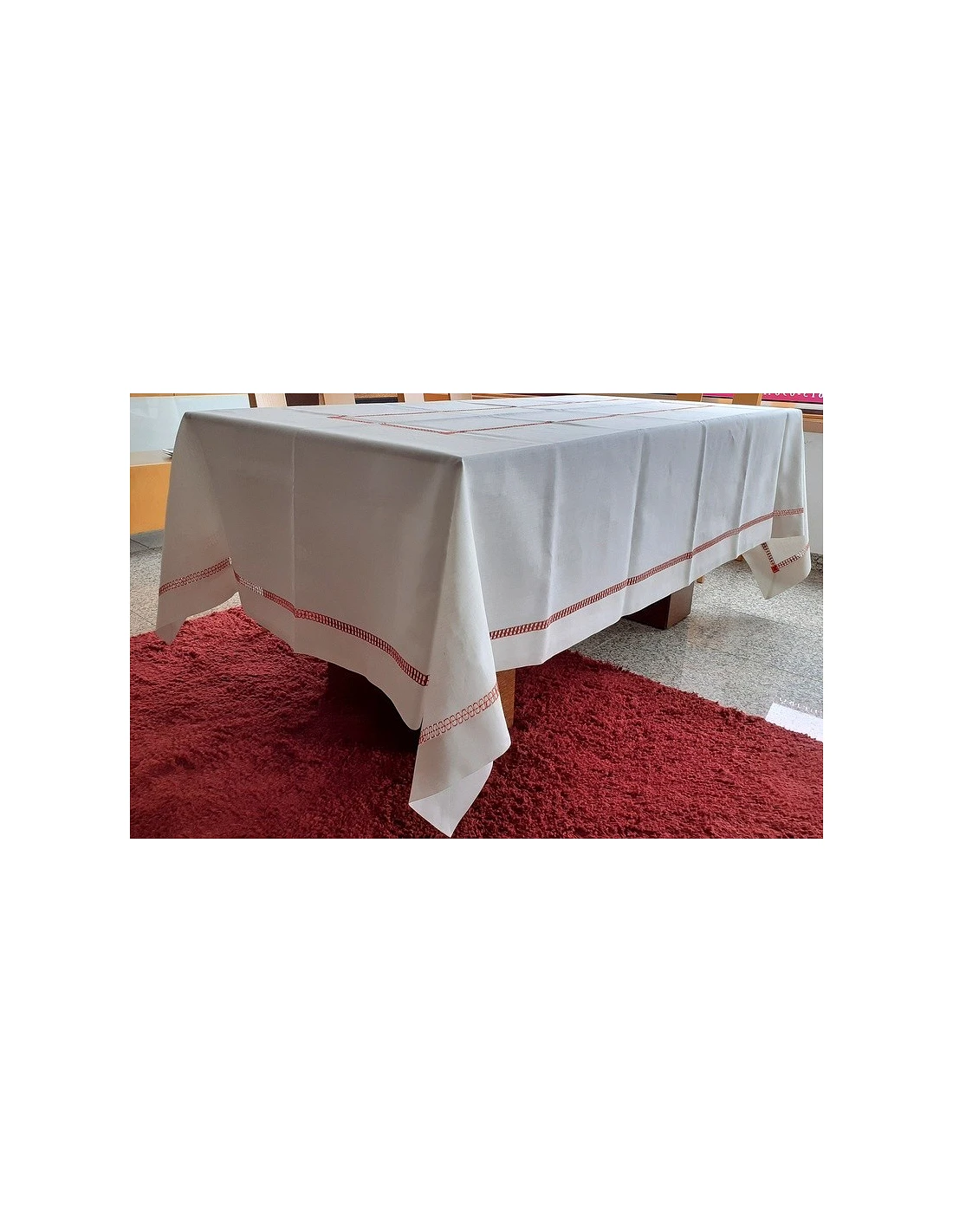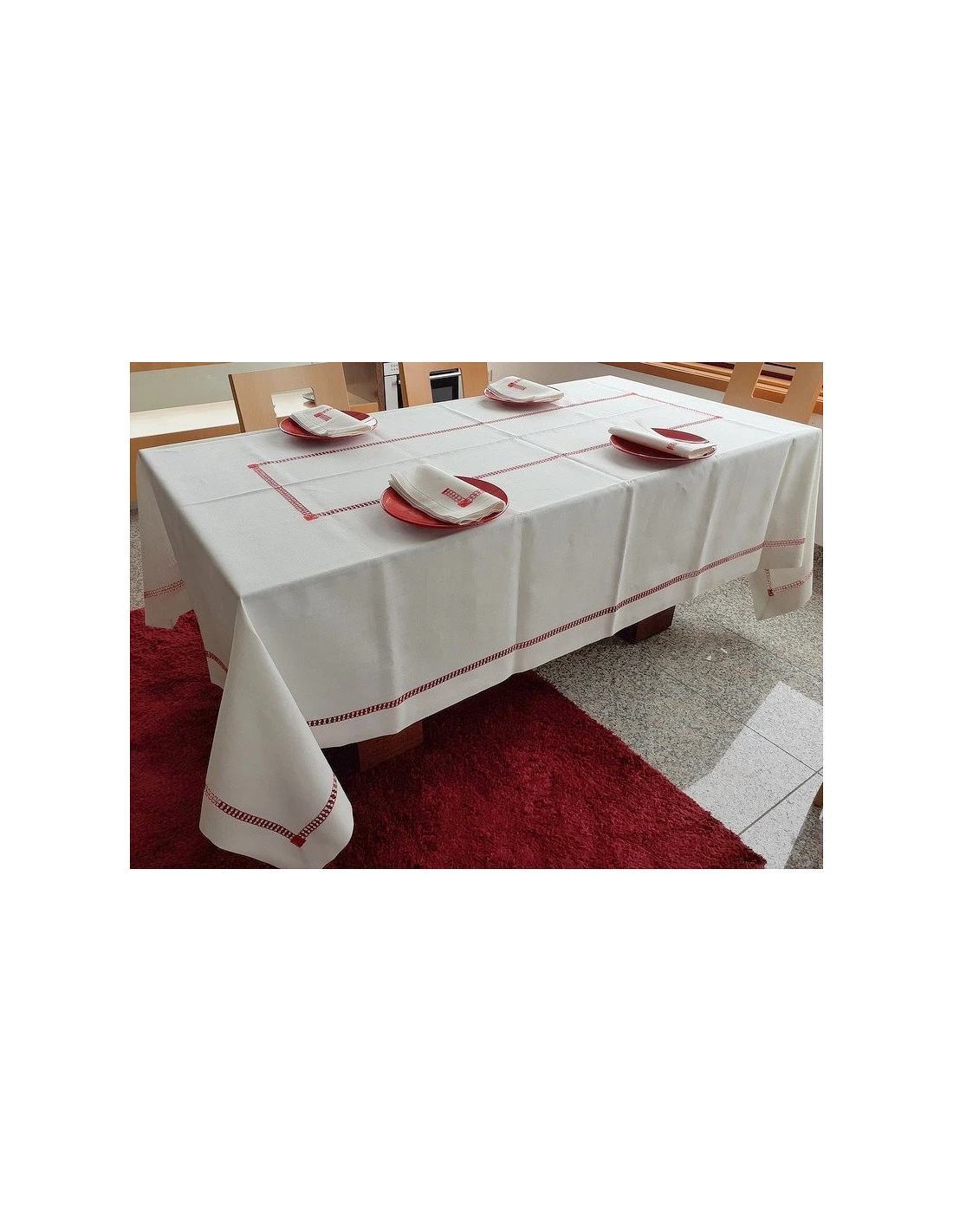 Mantel navideño hecho a mano, 100% lino portugués, mantel todo bordado a mano sobre cartoncillo, con hilo de algodón en color rojo. Vainica abierta (Bainha de molhos) a todo el alrededor del mantel y centro del mantel.