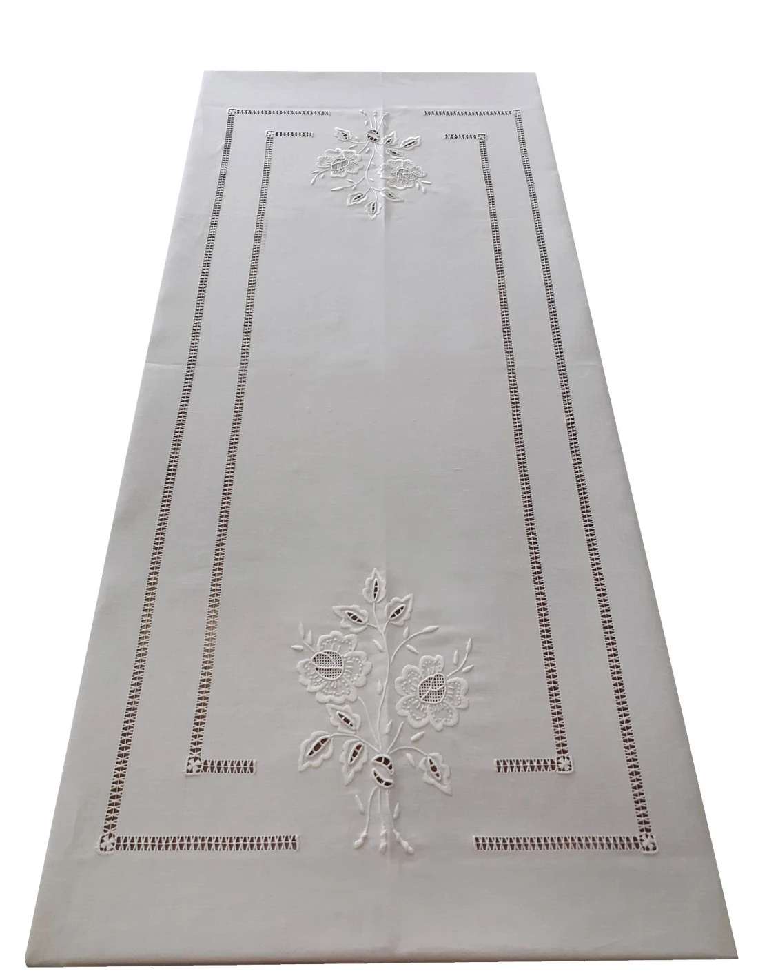 Mantel con 4 esquinas bordadas, laterales, extremidades y centro del mantel.