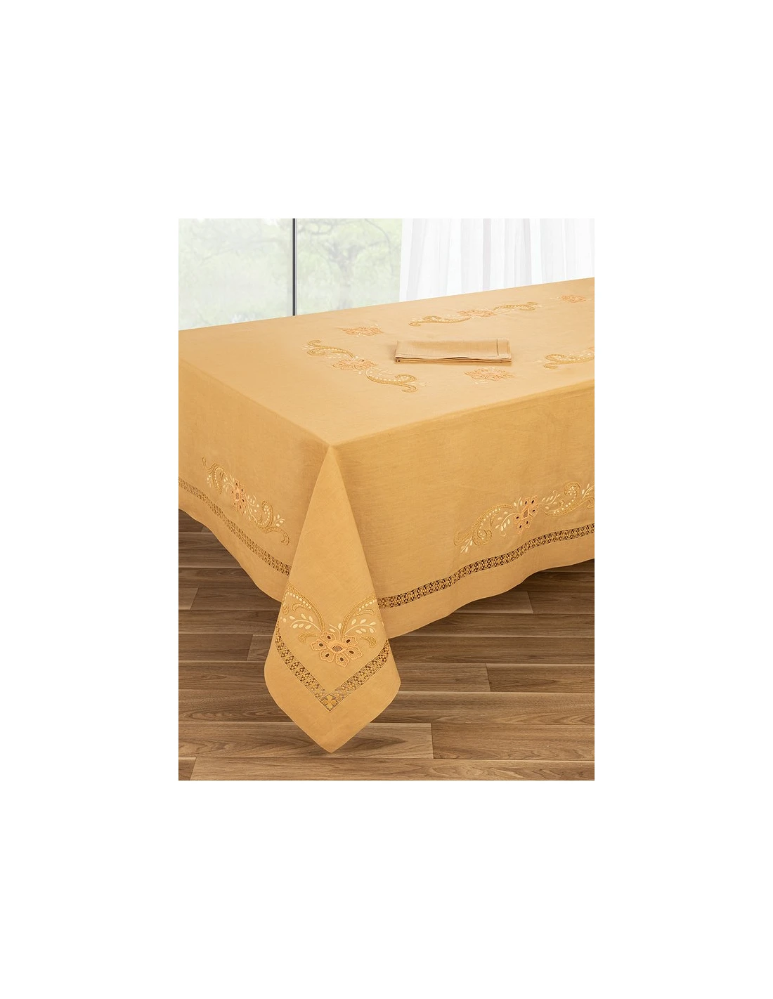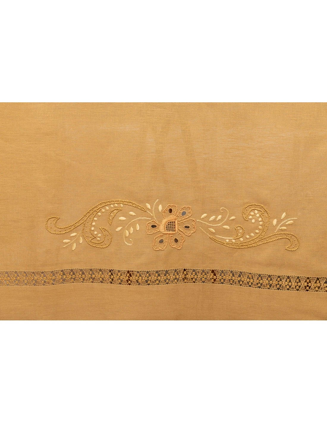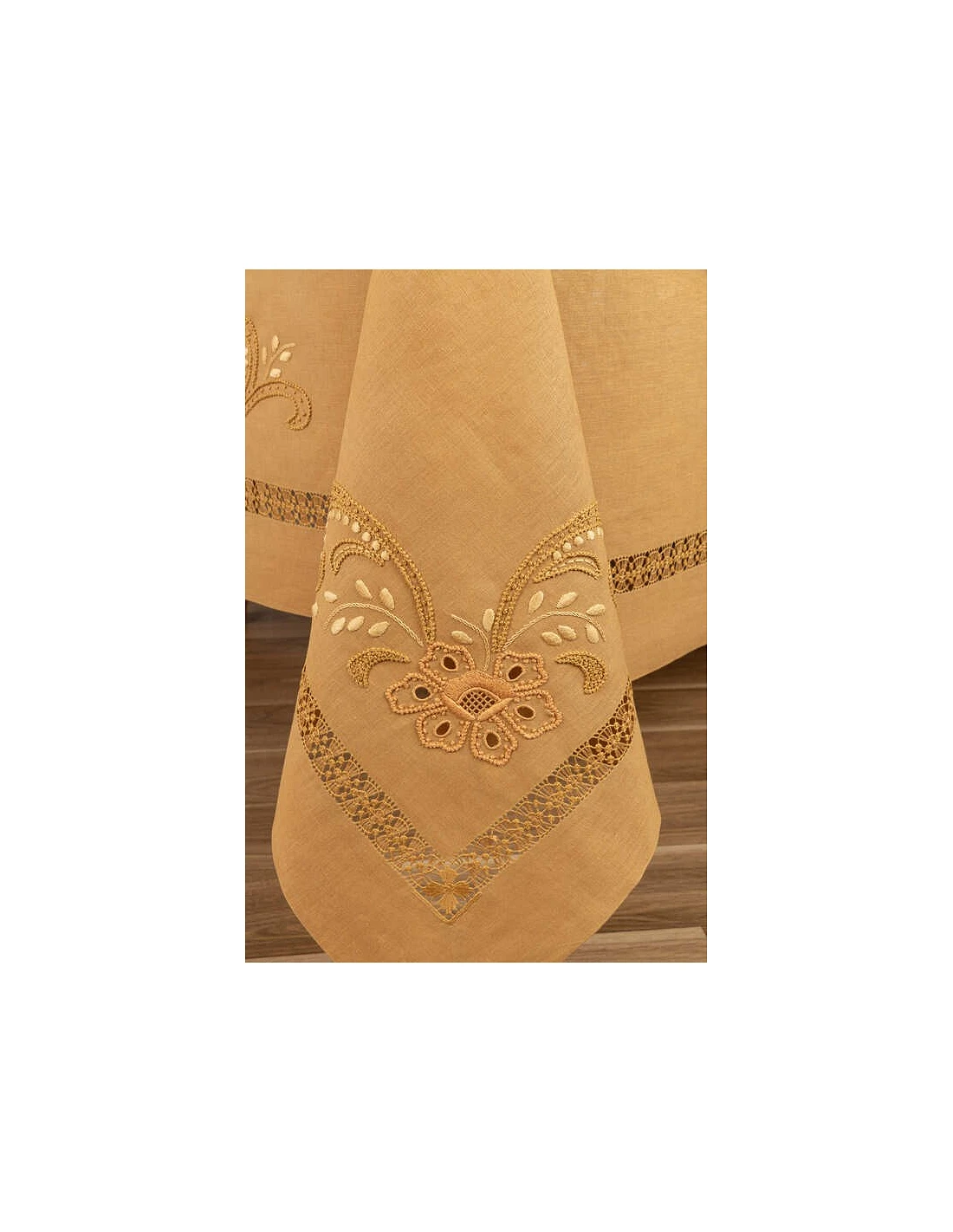 Mantel hecho a mano, 100% lino de color mostaza, diseño todo bordado a mano sobre cartoncillo, con hilos de algodón.