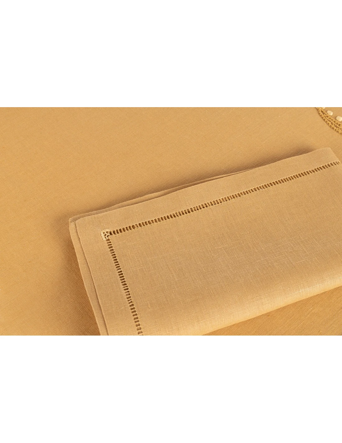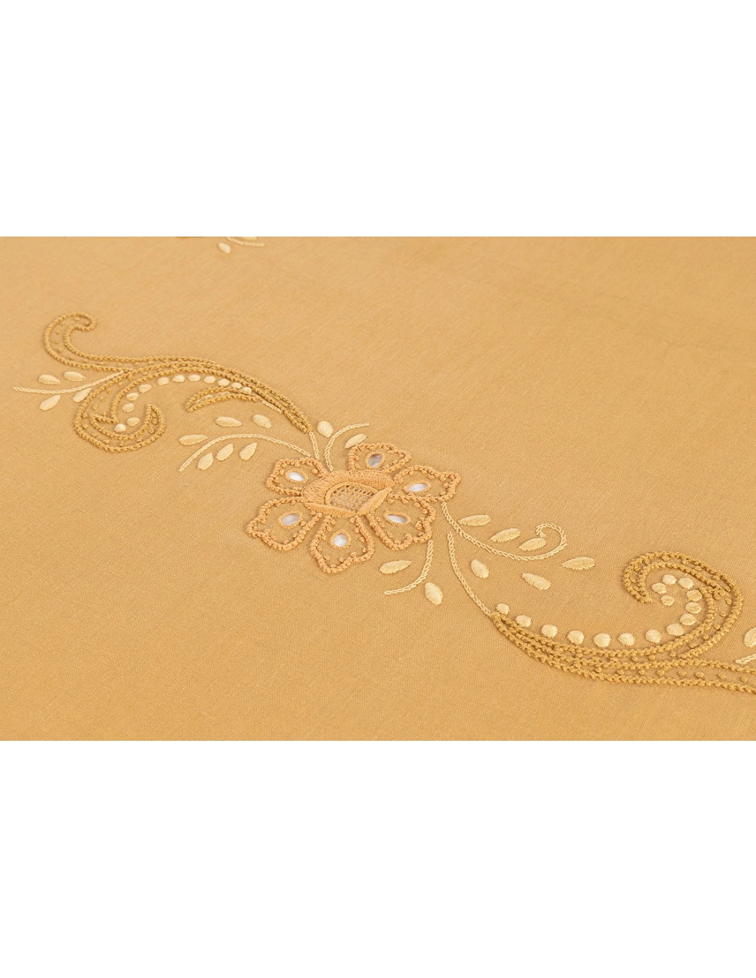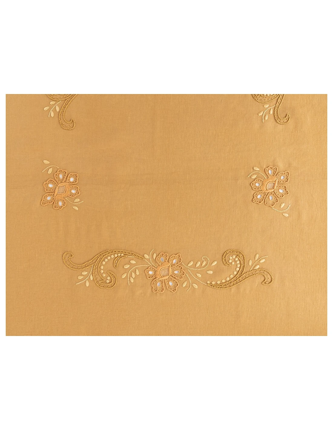 Mantel hecho a mano, 100% lino de color mostaza, diseño todo bordado a mano sobre cartoncillo, con hilos de algodón.