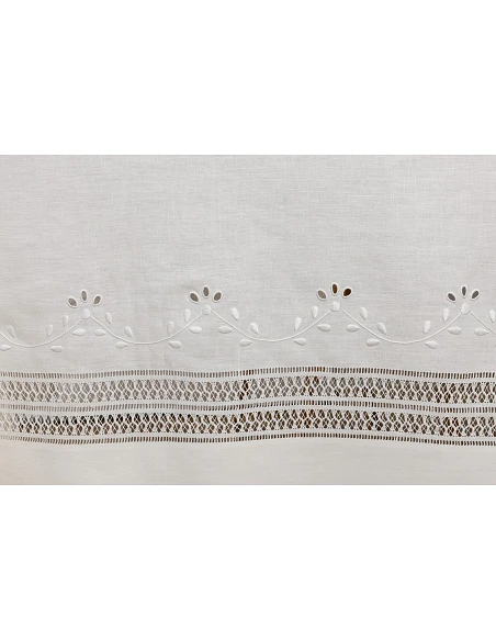 Mantel hecho a mano, 100% lino portugués de color blanco natural, diseño todo bordado a mano sobre cartoncillo, con hilos de algodón.
