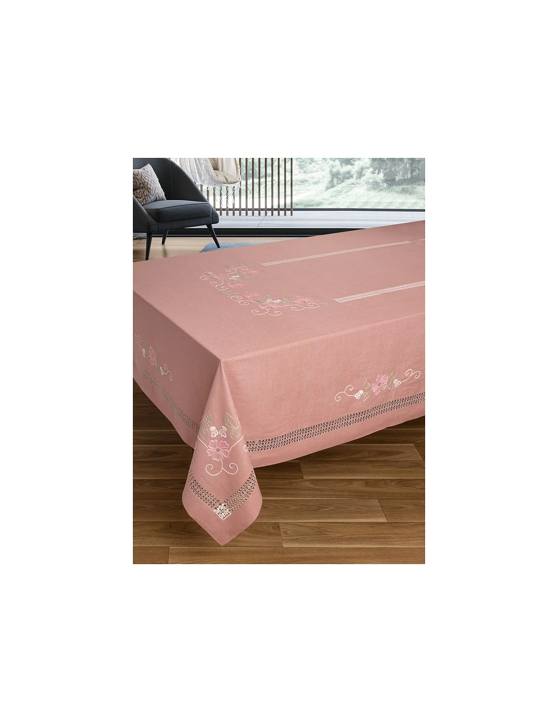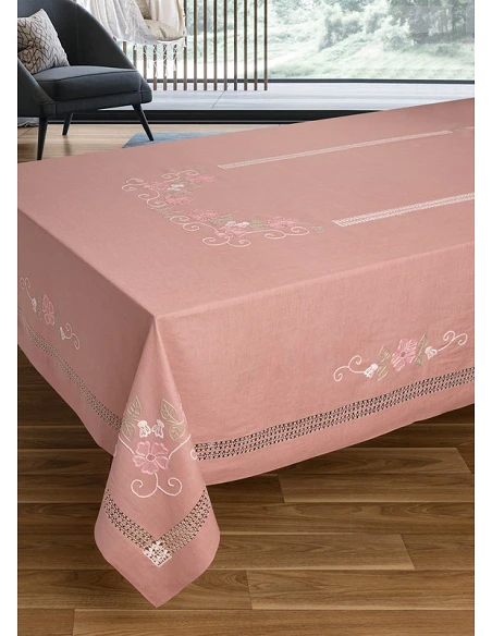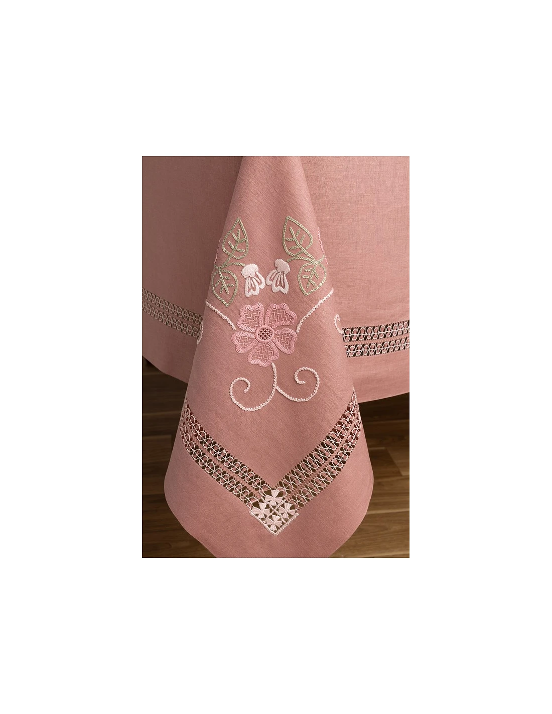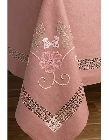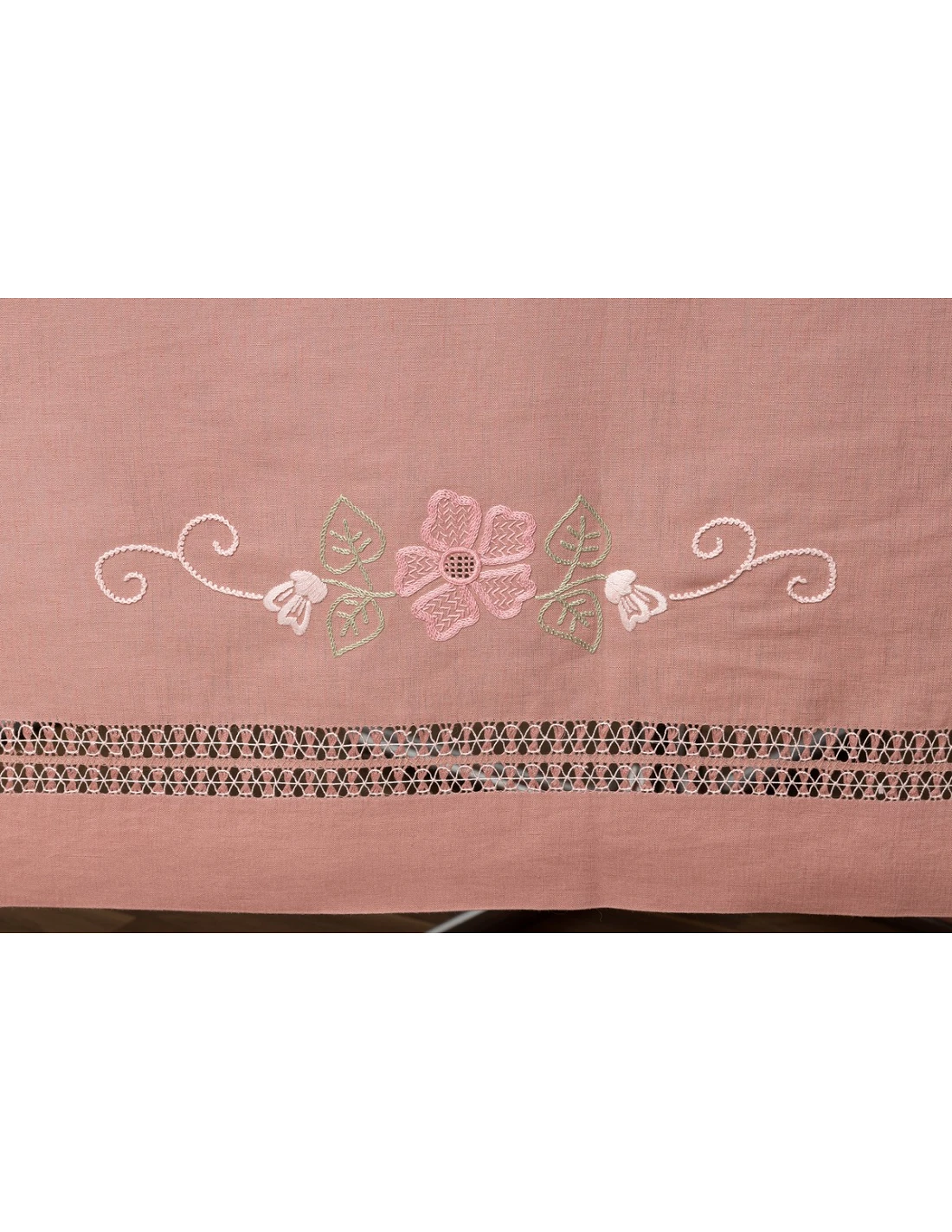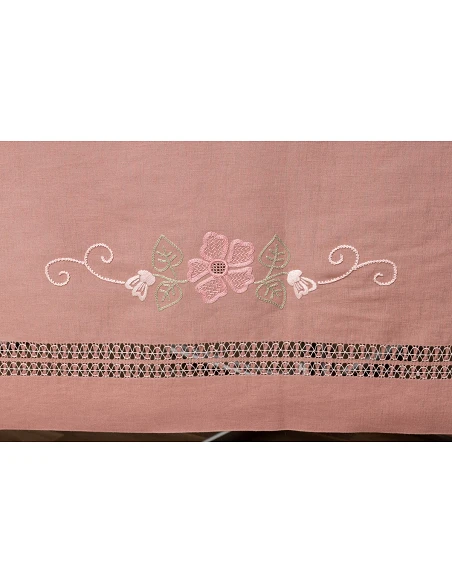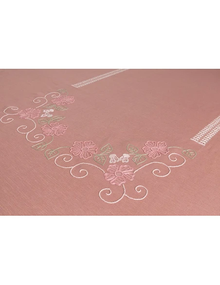 Mantel Mademoiselle 2022, todo hecho a mano, 100% lino de color rosa palo, diseño todo bordado a mano sobre cartoncillo, con hilos de algodón.