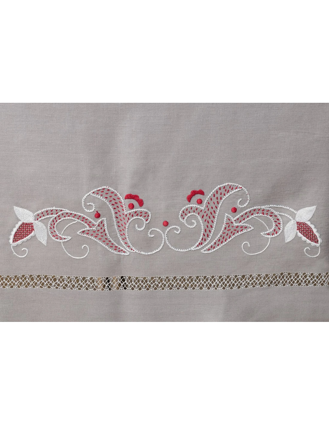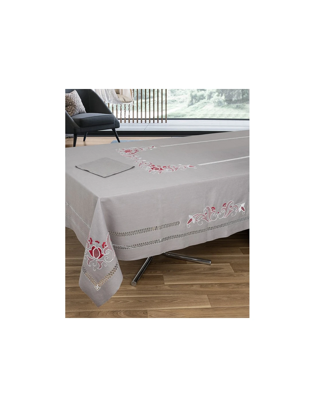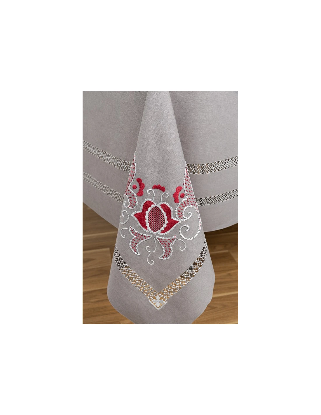 Mantel SUBLIME ARTE 2022, todo hecho a mano, 100% lino de color gris antracita, diseño todo bordado a mano sobre cartoncillo, con hilos de algodón.
