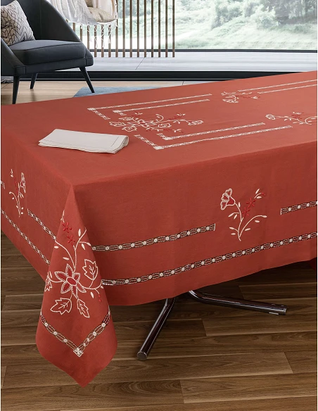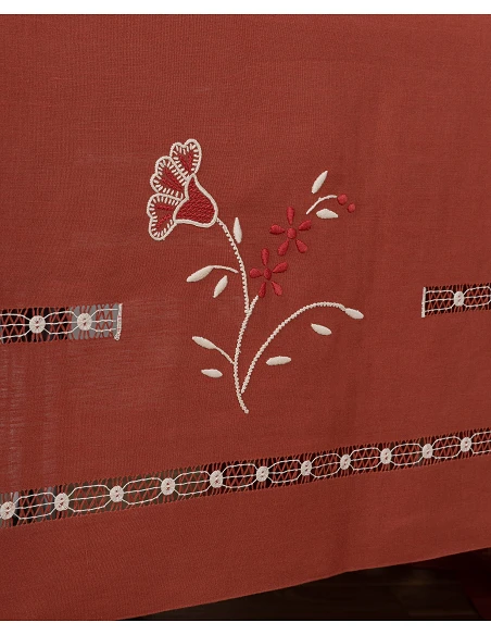 Mantel Bella Vitta 2022, todo hecho a mano, 100% lino de color teja, diseño todo bordado a mano sobre cartoncillo, con hilos de algodón.