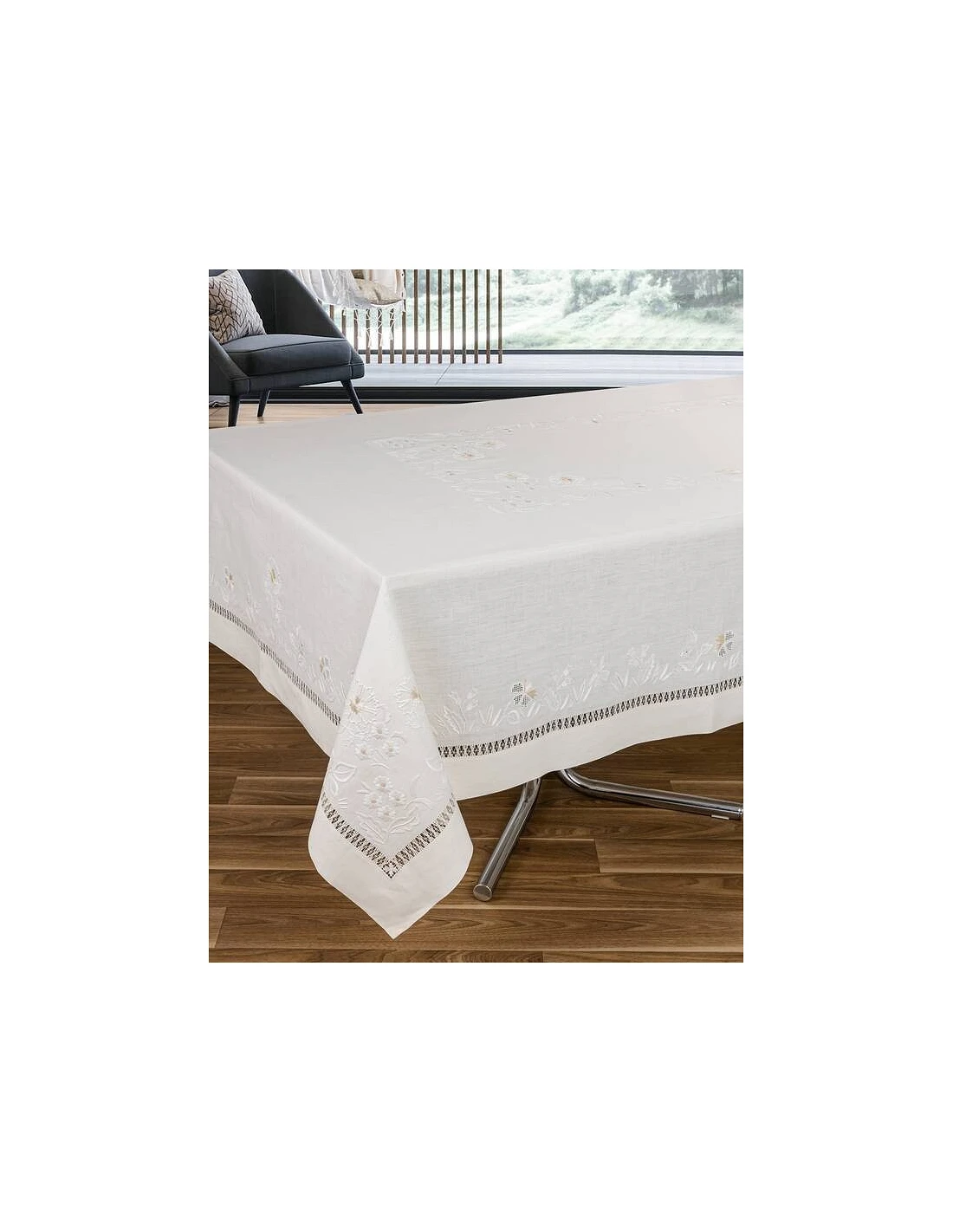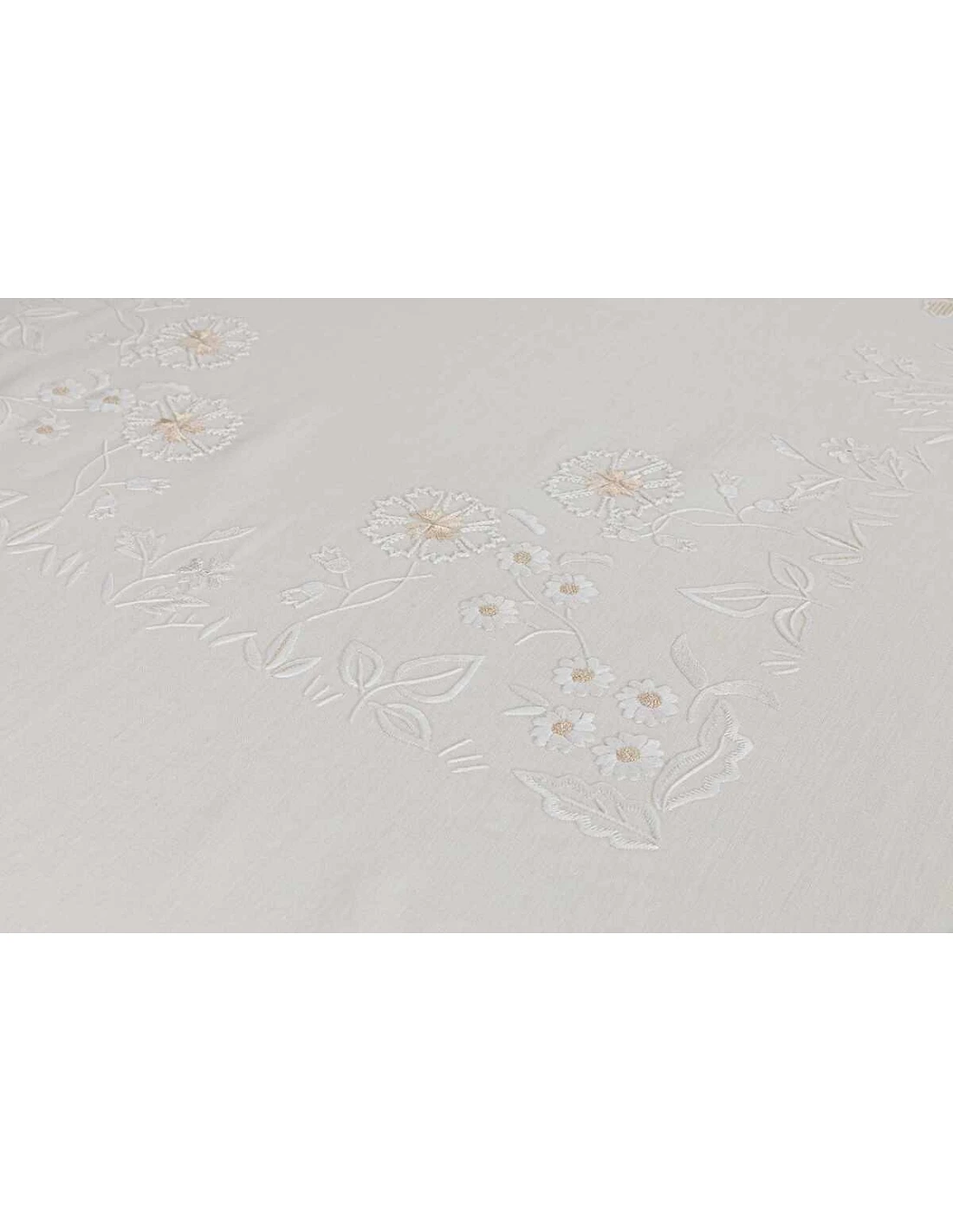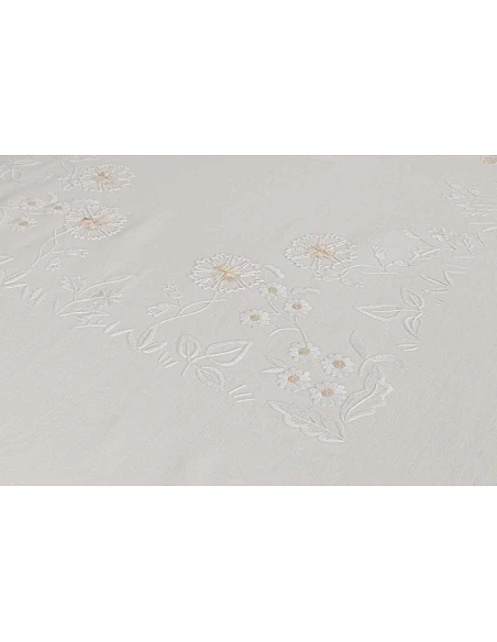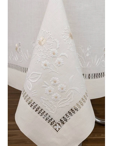 Mantel con 4 esquinas bordadas, centro del mantel, laterales y extremidades.