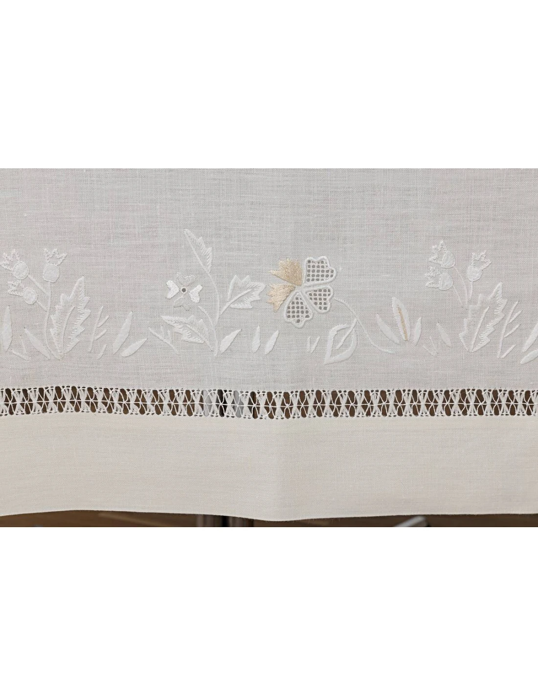 Mantel Jardim encantado 2022, todo hecho a mano, 100% lino, diseño todo bordado a mano sobre cartoncillo, con hilos de algodón y seda.