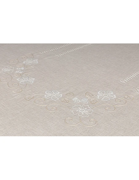 Mantel con 4 esquinas bordadas, centro del mantel, laterales y extremidades.