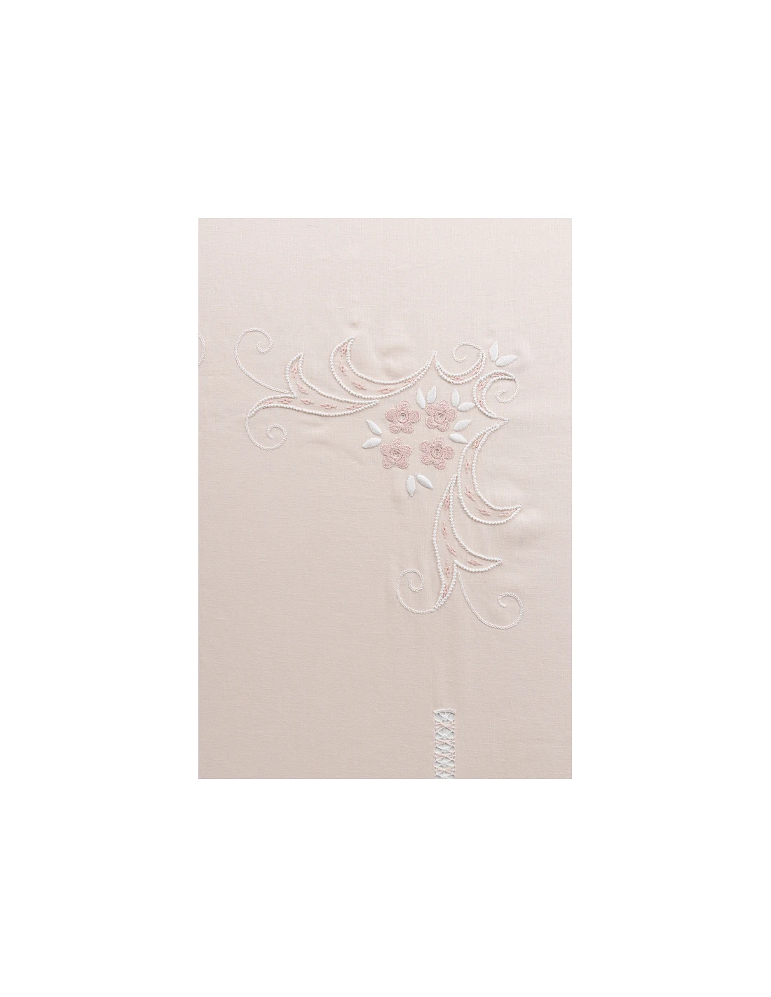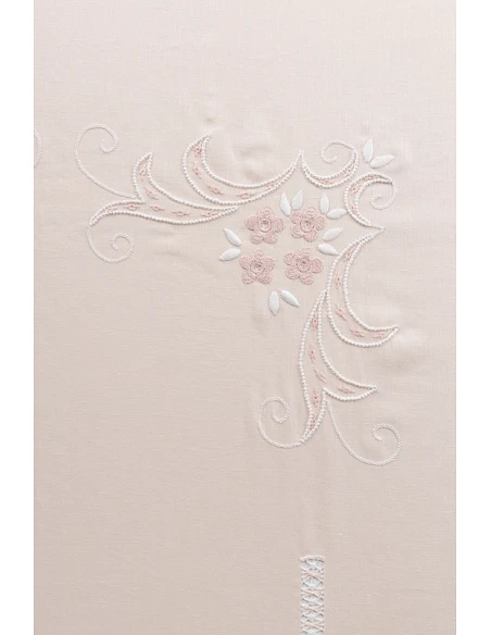 Mantel Creative Pascoa 2024, todo hecho a mano, 100% lino de color rosa pastell, diseño todo bordado a mano sobre cartoncillo, con hilos de algodón.