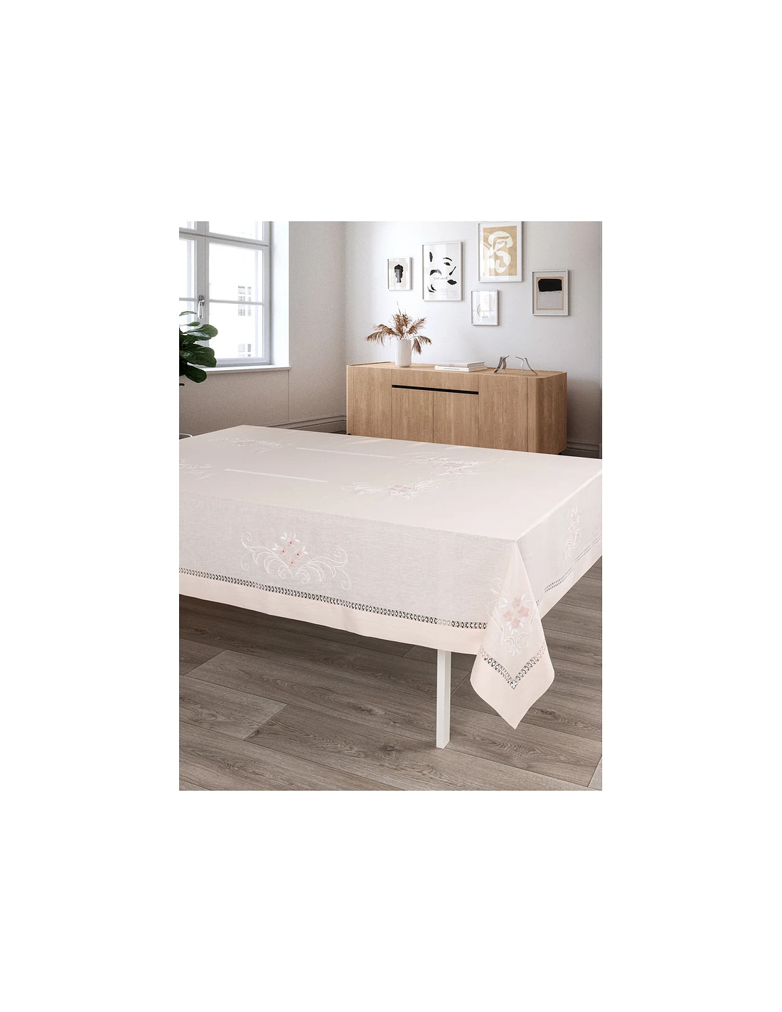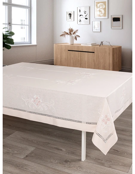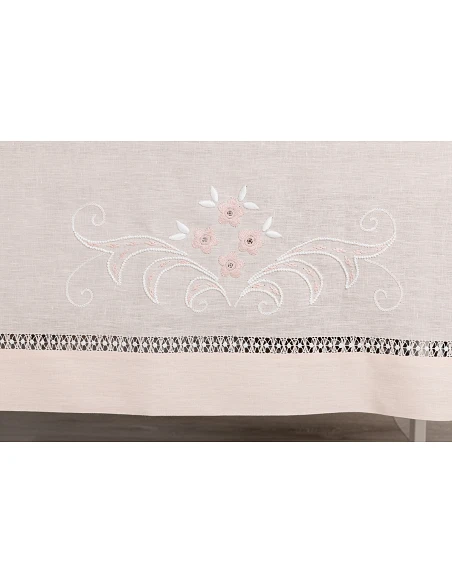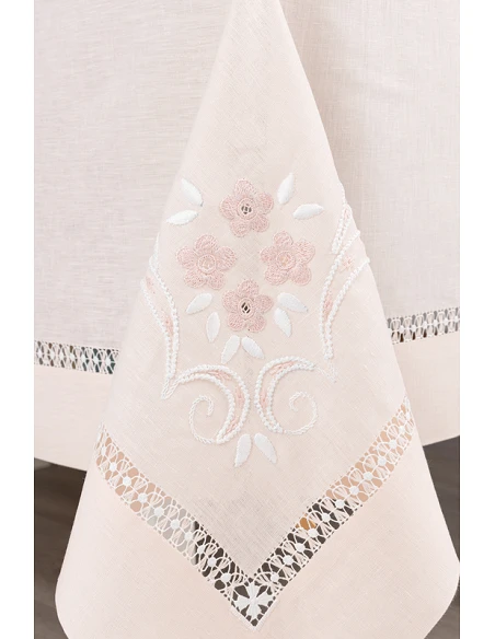 Mantel con 4 esquinas bordadas, centro del mantel, laterales y extremidades.