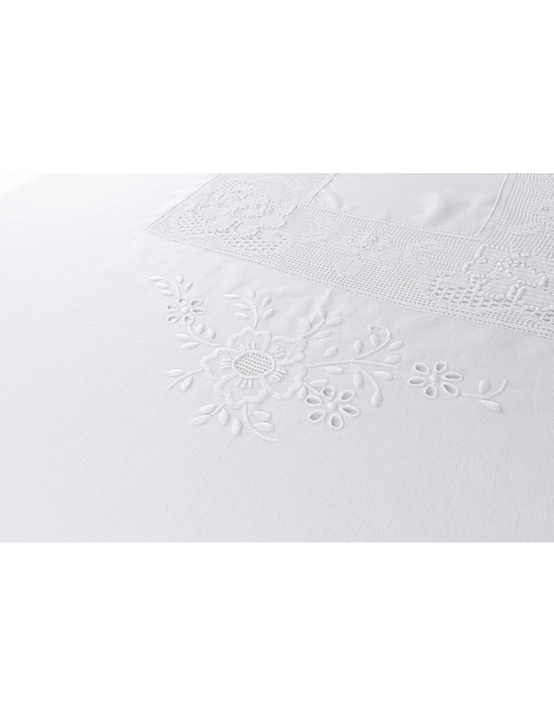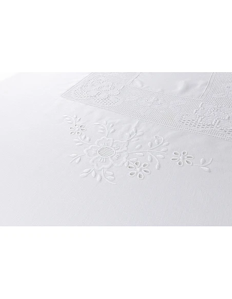 Mantel hecho a mano, tejido 100% lino portugués de color blanco natural, diseño todo bordado a mano sobre cartoncillo, con hilos de algodón. Aplicada puntilla de ganchillo hecha a mano.