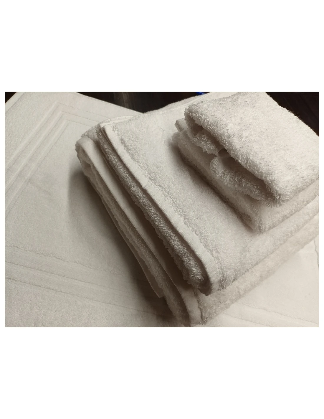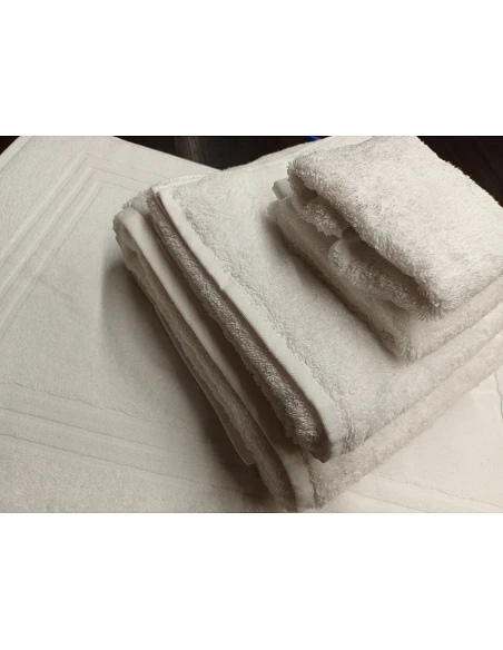 Toallas con 600 gr./m2, desarrolladas específicamente para hoteles, spa y centros de estética, por ello los dobladillo laterales van cosido duplo, solidez al lavado hasta 60°. Color blanco optico.
