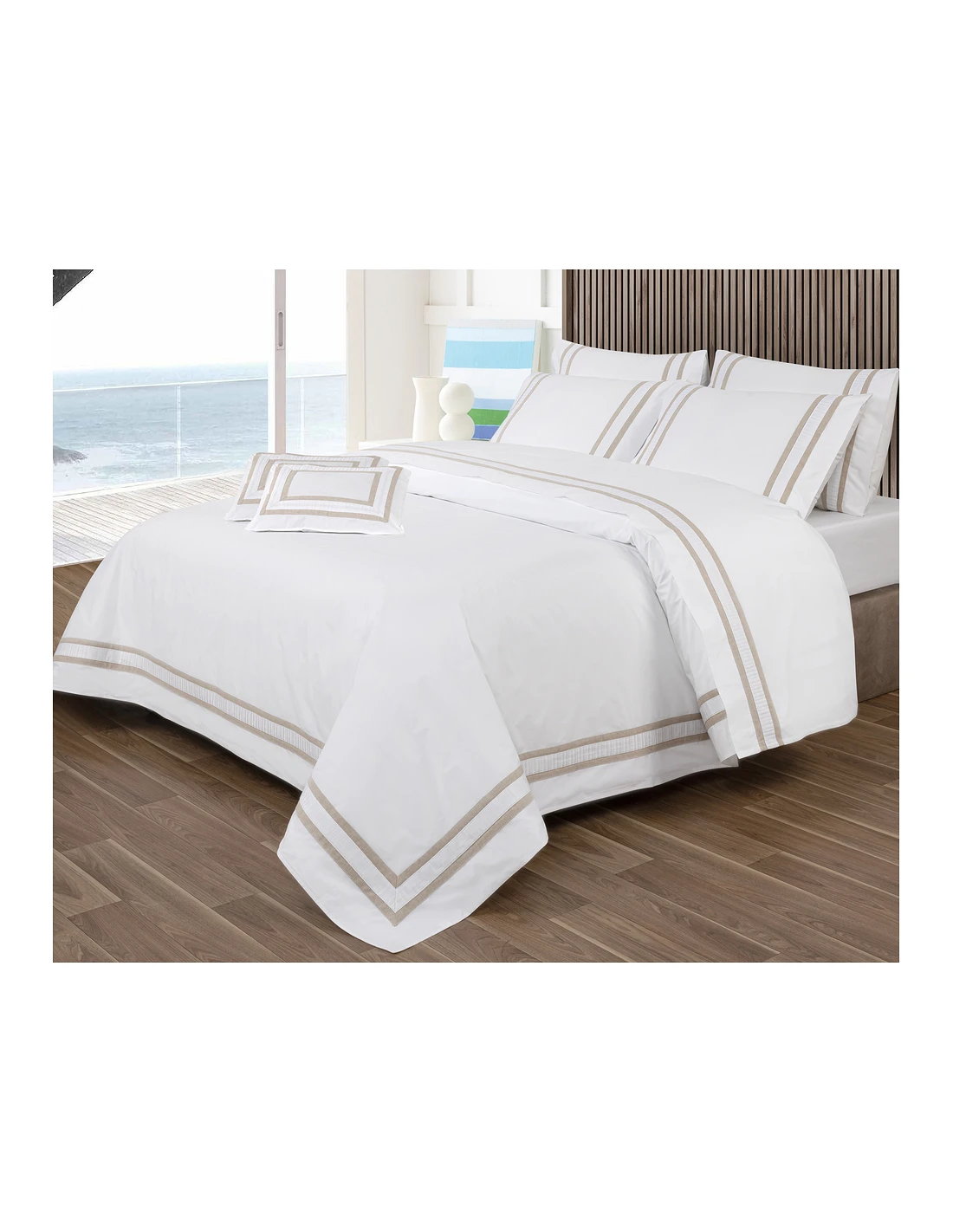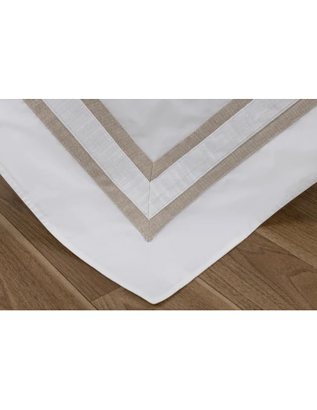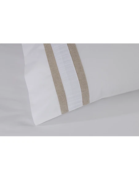 Barras em linho aplicadas em lençol superior e fronhas nos 2 lados.