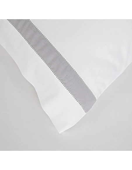 Tecido lençol inferior cor branco. Tecido lençol superior branco c/ aplicação cinza.