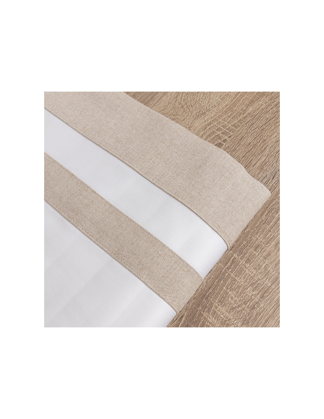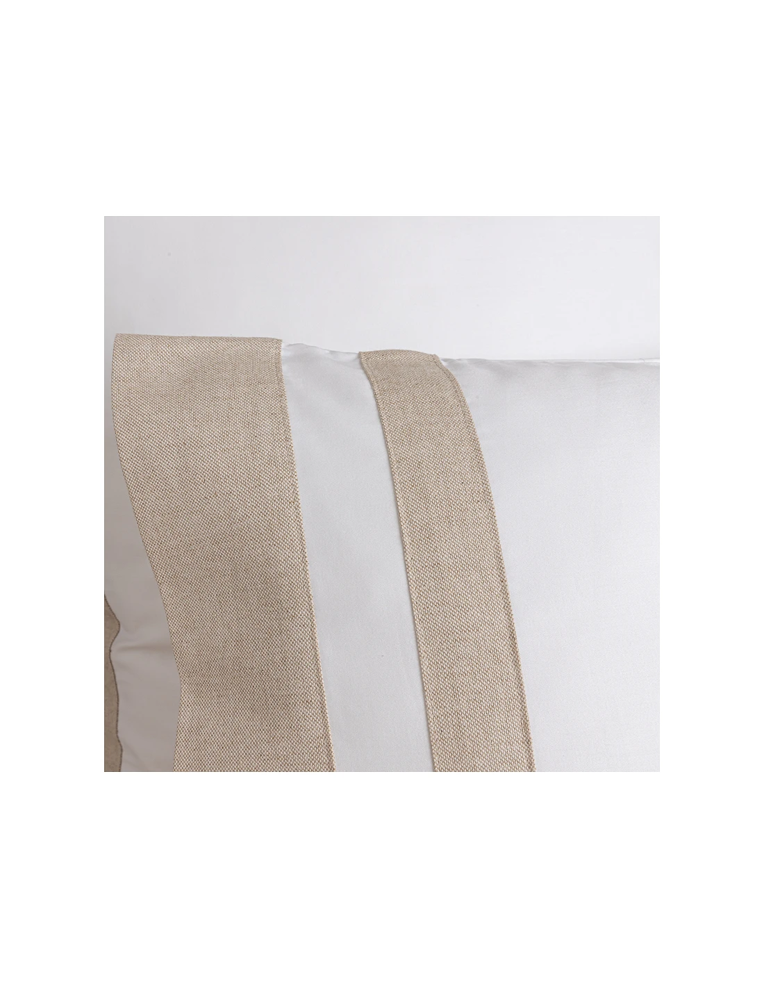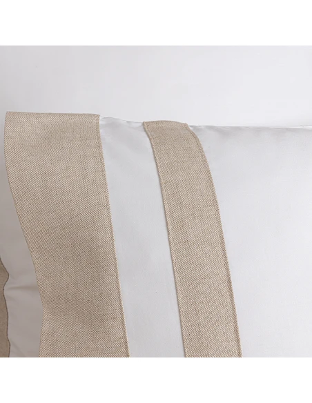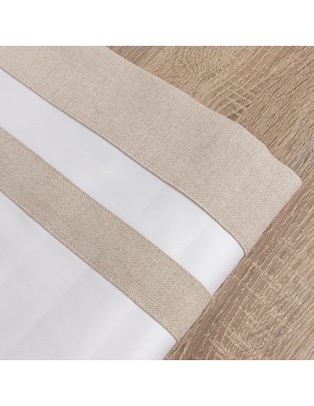 Barras em linho aplicadas em lençol superior e fronhas nos 2 lados.