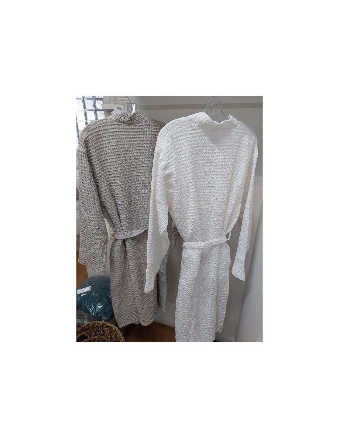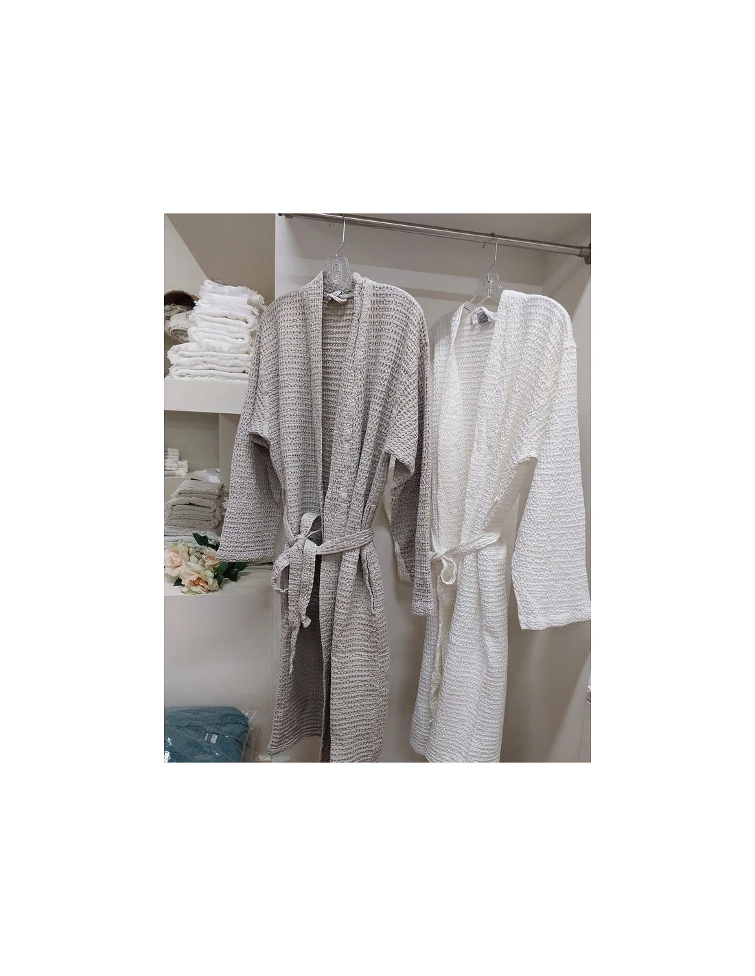 Roupão com cinto, bolsos laterais e presilha para pendurar.
