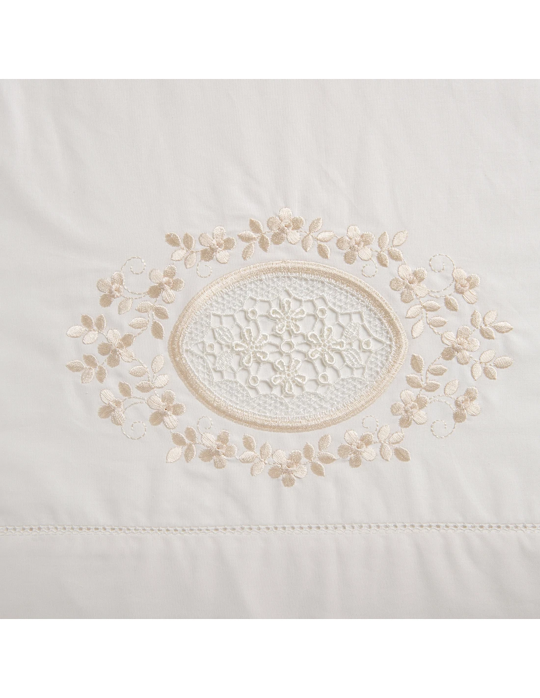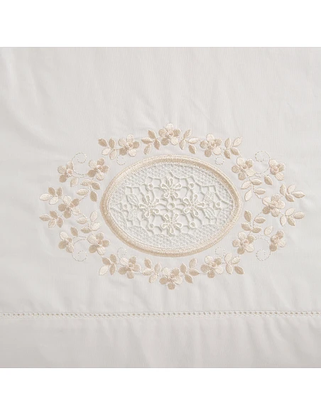 Lençol superior com bordado directo, guipur e ajour em toda a largura do lençol.
