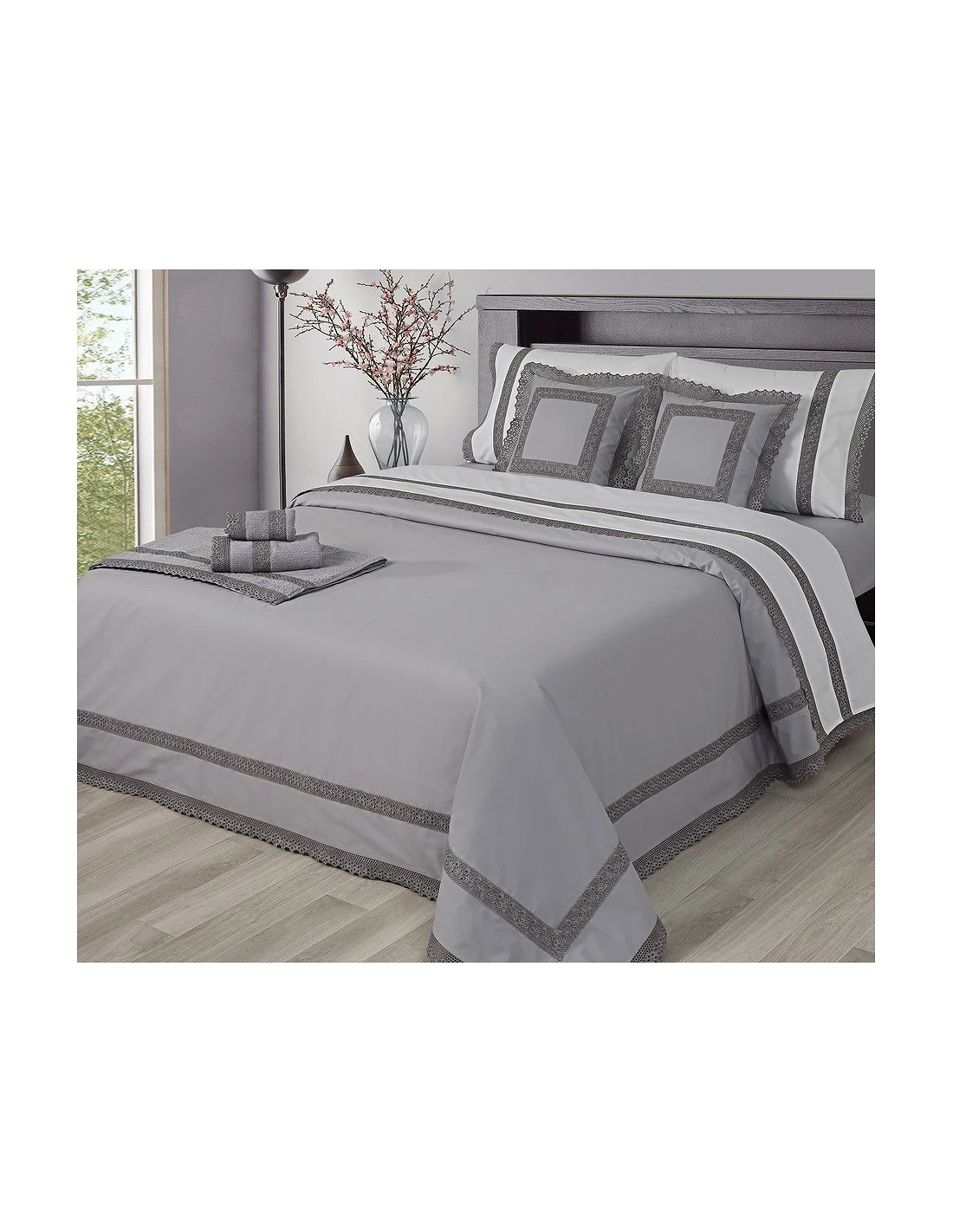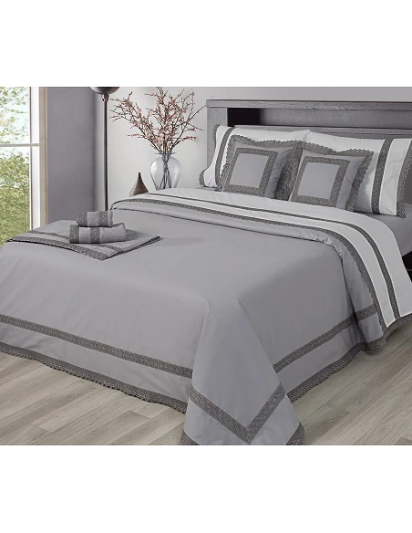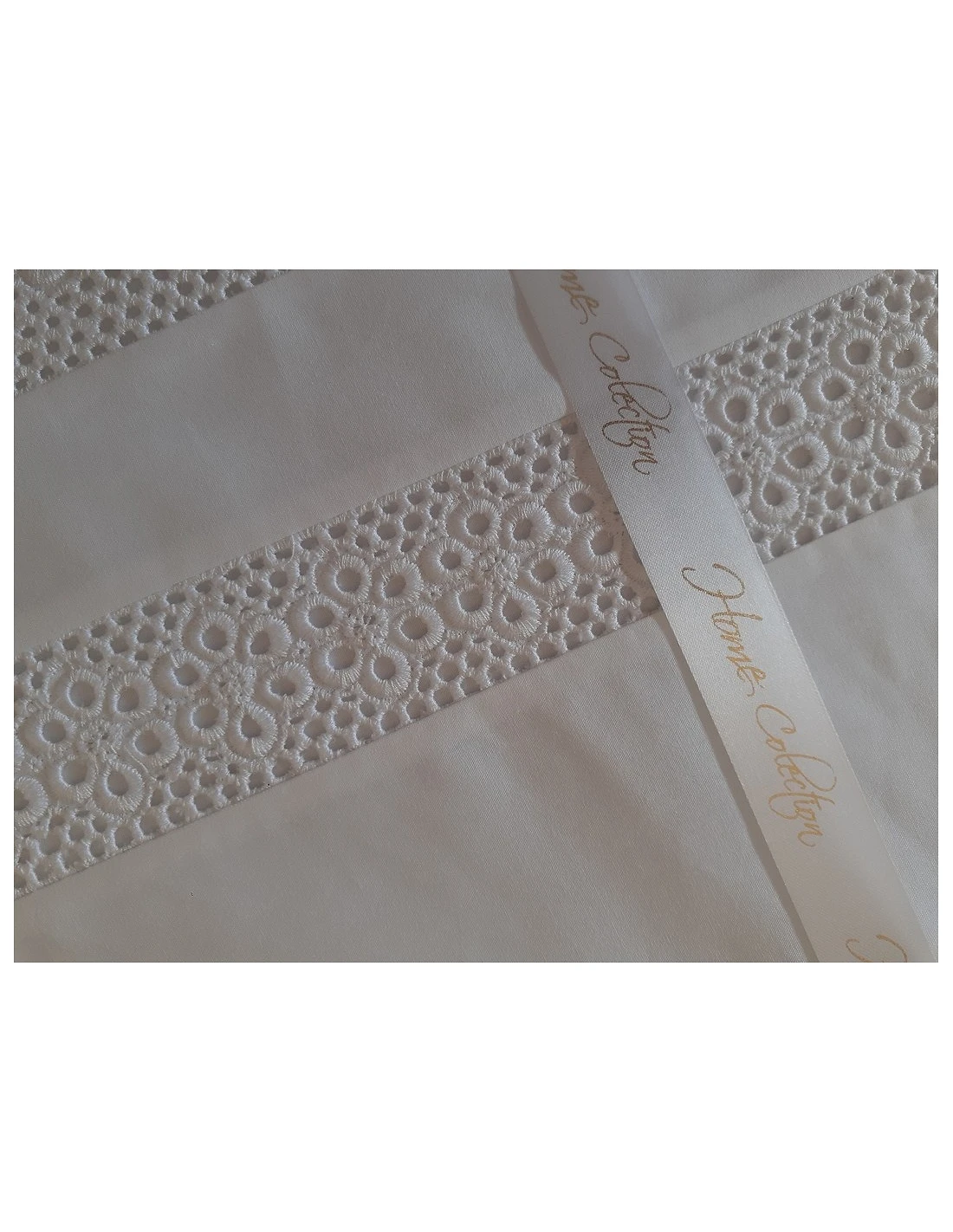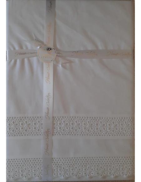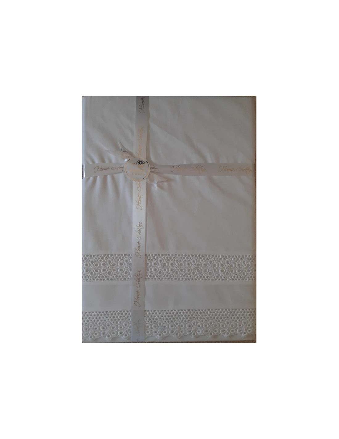 Renda e entre meio aplicado na mesma cor branco, no lençol superior e fronhas 1 lado.