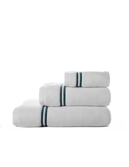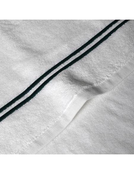 Jogo de 3 toalhas, felpo cor branco con 2 rolinhos verde escuro.
