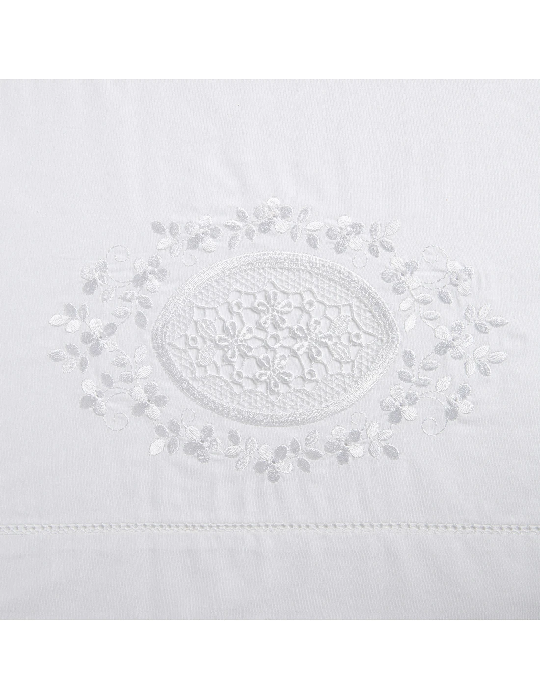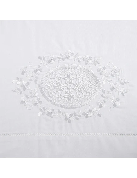Lençol superior com bordado guipur e ajour em toda a largura do lençol e fronhas 2 lados.