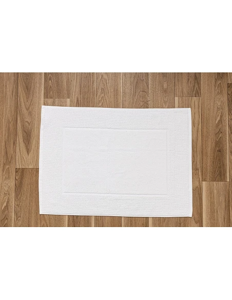 Tapete com 700 gr./m2, desenvolvido especificamente para hotéis, spas e centros de estética, com costura dupla, solidez à lavagem a 60°, fio duplo 24/2 convencional duplo torcido, alta absorção e suavidade.