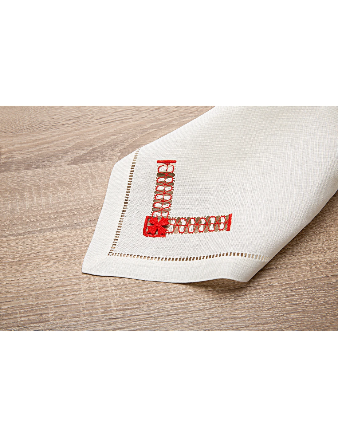 Individual de mesa e guardanapo 100% linho nacional, peças bordadas à mão no papelão, com fios de algodão cor vermelho. Ponto aberto no guardanapo bordado e Bainha de molhos a toda a volta do individual de mesa.