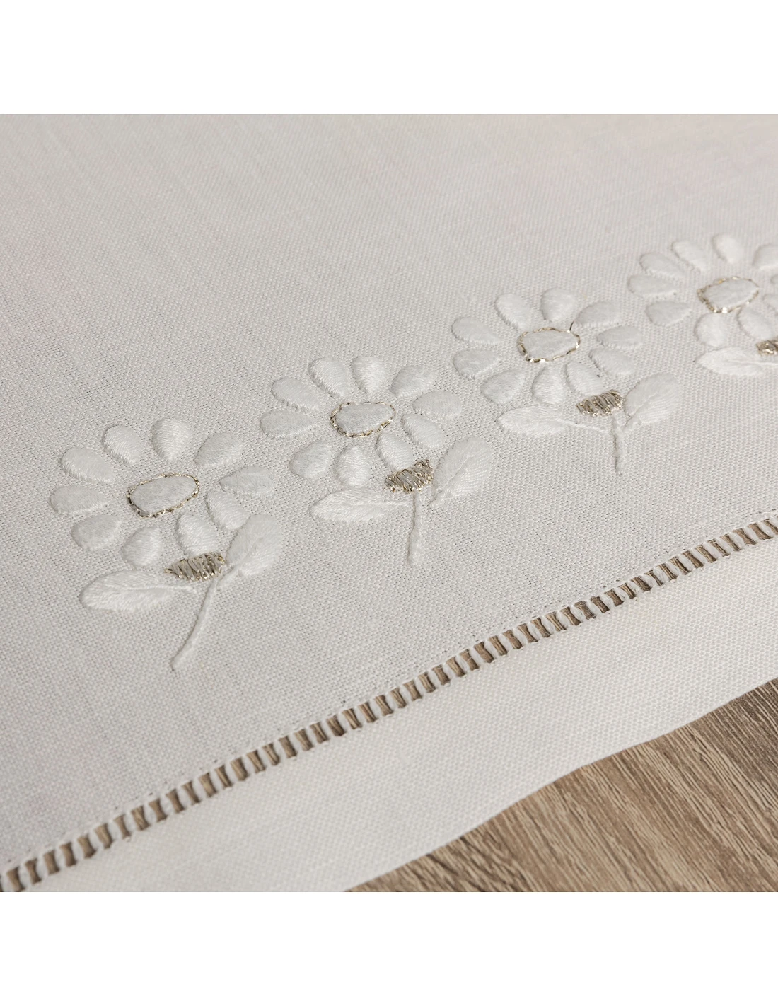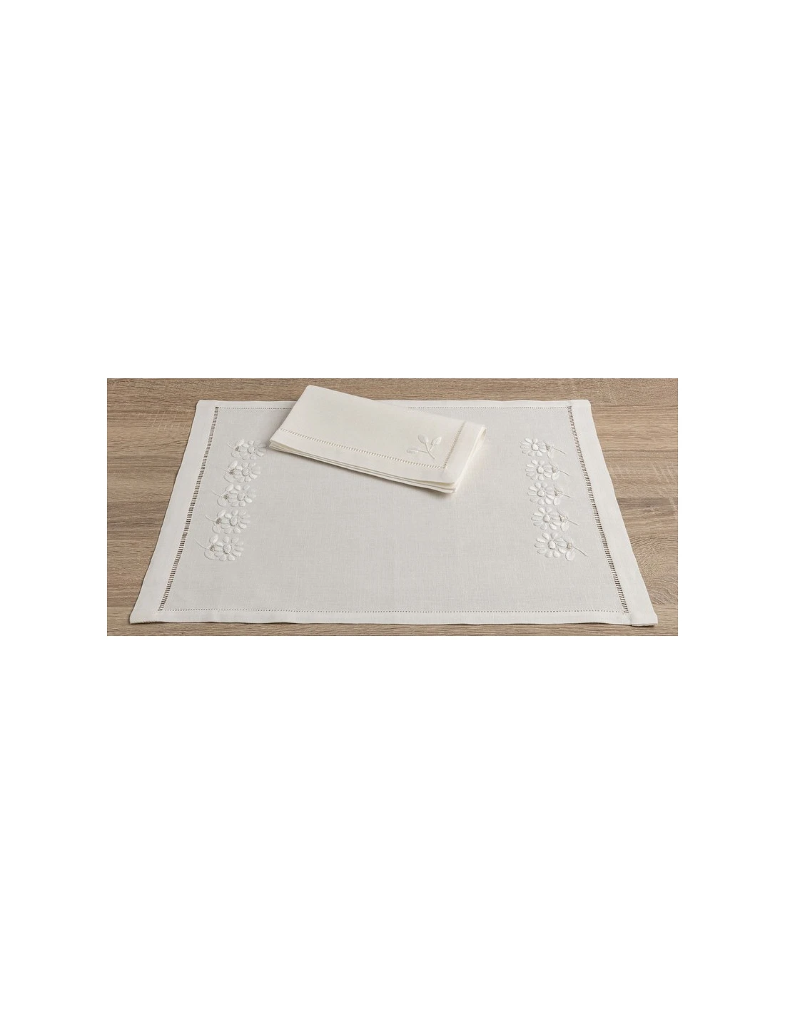 Individual de mesa e guardanapo 100% linho nacional, peças bordadas à mão no papelão, com fios de algodão a cor C/ fio prata. Ponto aberto no guardanapo bordado e Bainha a toda a volta do individual de mesa bordado flores.