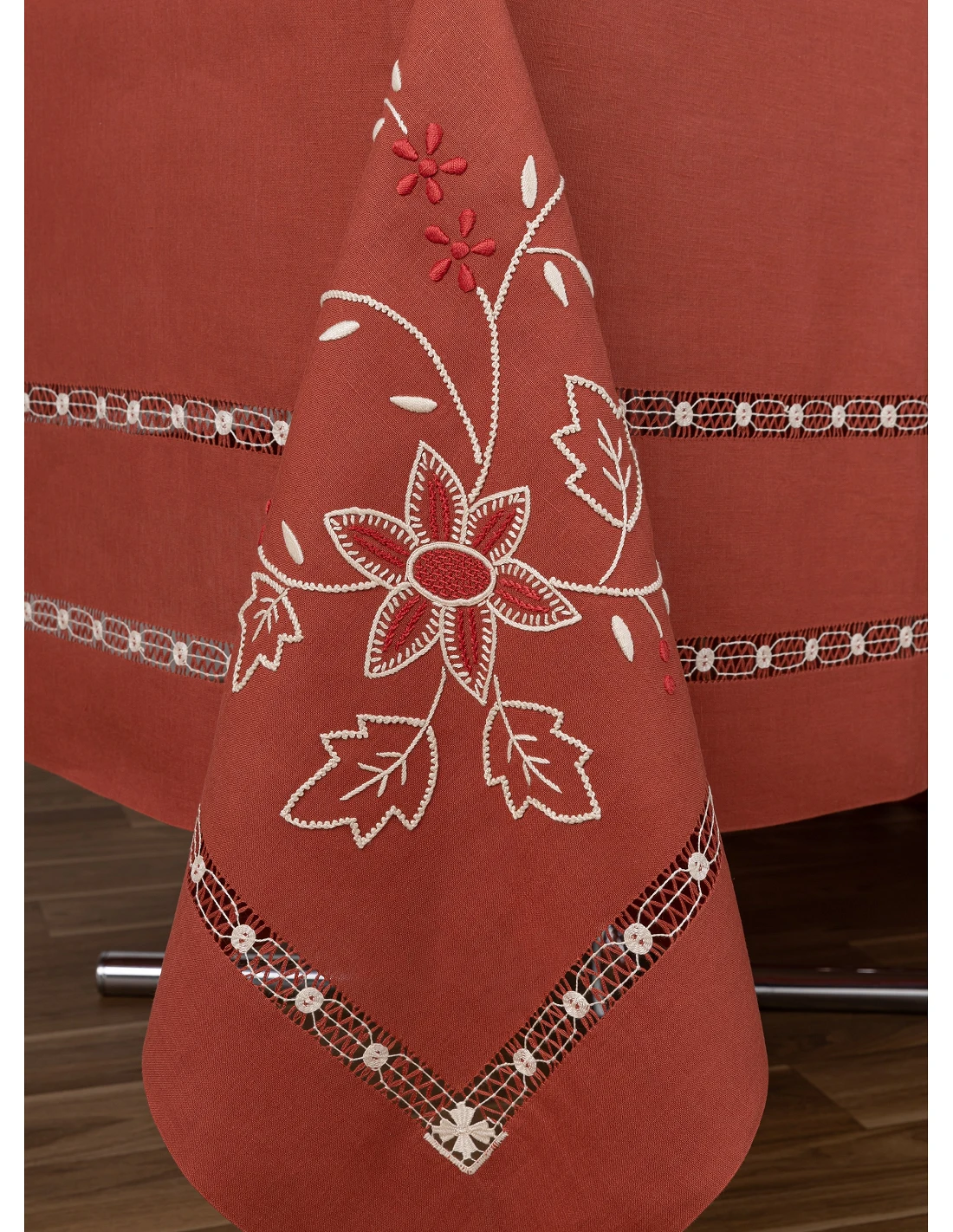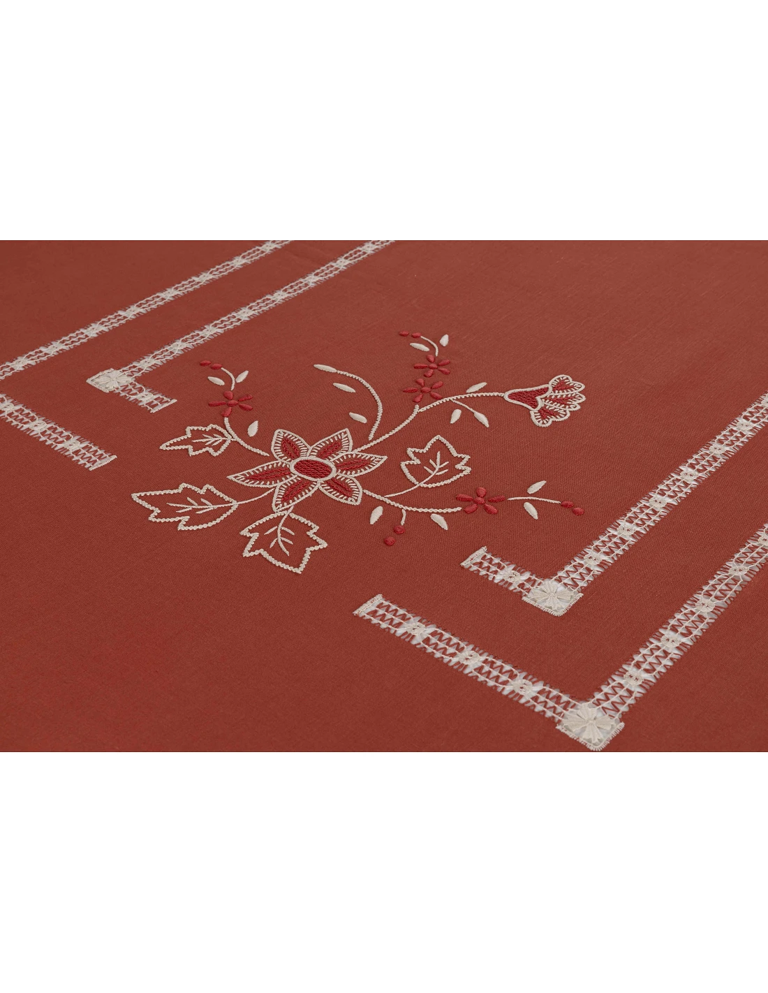 Toalha com os 4 cantos bordados, centro da mesa, laterais e topos.
