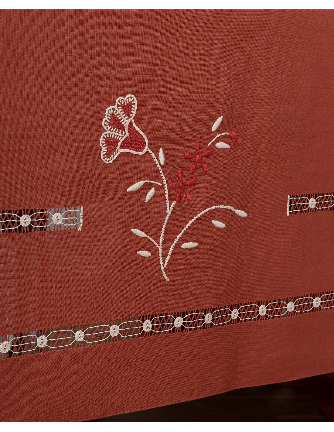 Toalha 100% linho, cor telha. Toalha toda bordada à mão no papelão, com fios de algodão.