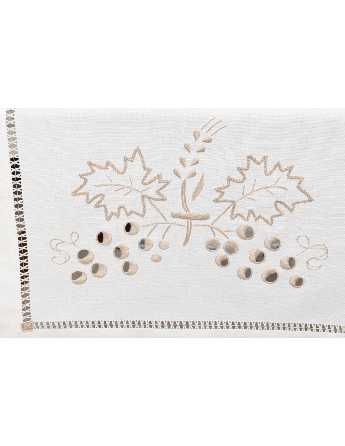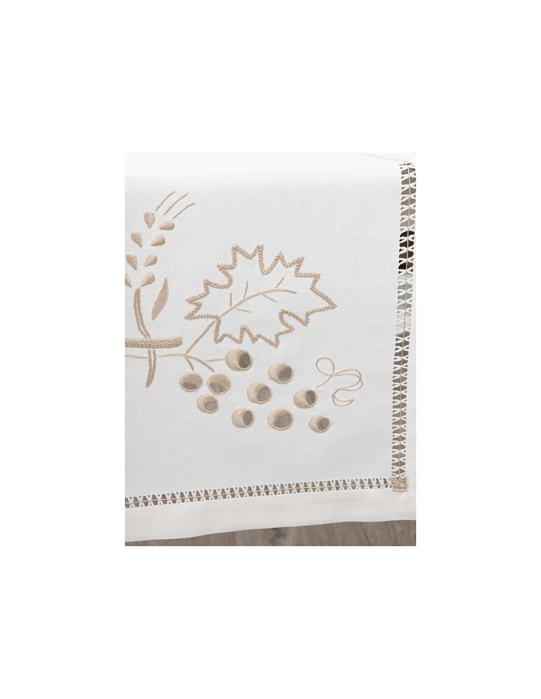 Caminho de mesa 60% linho nacional 40% algodão, peça bordada à mão no papelão, com fios de algodão de cor. Ponto aberto (Bainha de molhos) a toda a volta do tecido.