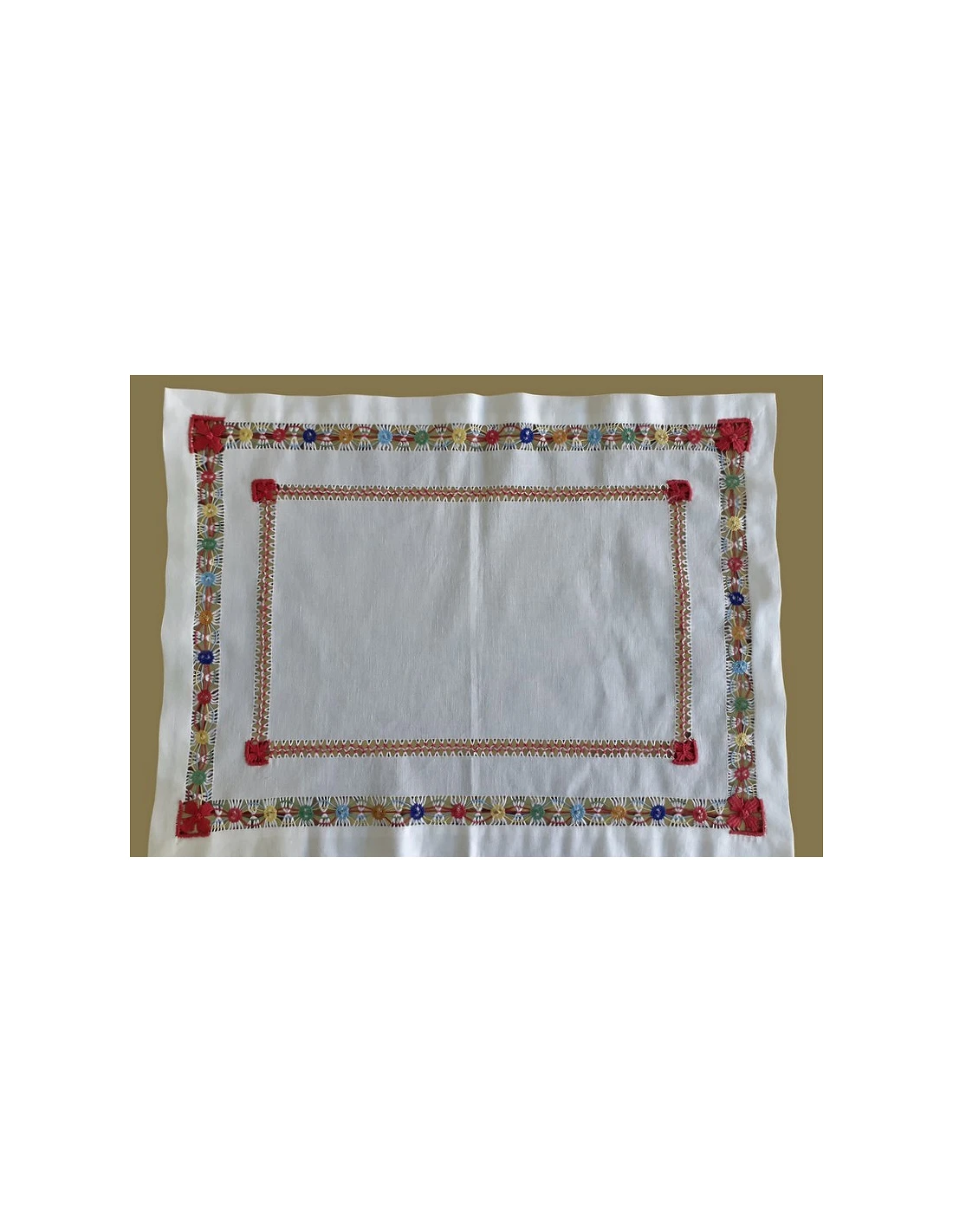 Individual de mesa 100% linho nacional, individual todo bordado à mão no papelão, com fios de algodão de várias cores. Bainha de 3 linhas a toda a volta entrelaçada com fios / cores.